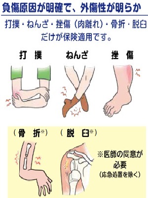 しかし“外傷によるケガ”であっても、“骨折”と“脱臼”は、接骨院(整骨院)で十分に検査したり治療したりする事ができないので、実際に保険適用が認められるのは、①足首や指などの関節をひねって痛めた『捻挫』、②身体をぶつけた『打撲』、③転倒や打撲などによる筋違いや肉離れの『挫傷』、の3種類になります。