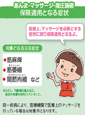 この為、『筋麻痺』や『関節拘縮』などの症状で、治療を受けても効果が現れなかったり、医師による適当な治療手段が見当たらなかったりした場合に、“苦痛緩和”や“機能回復を補う手段”として、『必要最低限の医療』の範囲で、保険を使ったマッサージを受ける事ができます。