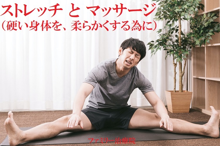しかし、身体が硬くなると、疲労が起き易くなって、いつまでも疲労が続いたり、あるいは、身体に疲労が溜まって、ダルサ感、肩こり、背部痛、腰痛、身体が重い感じ、などに悩まされたりします。