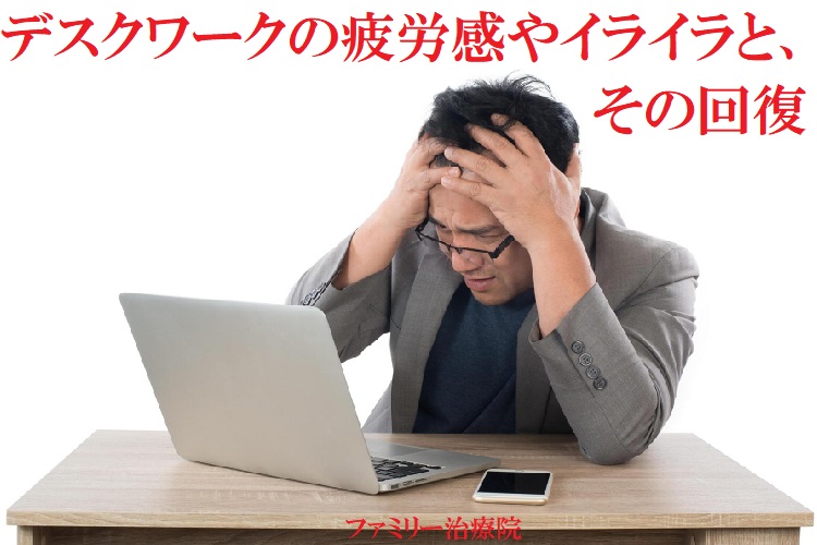 例えば、座り仕事を続けていると、「腰の疲労感が続く」、「脚や腰の筋肉がコワバル」などが起き、更に、全身の血液循環も悪化してくるので、「背中や肩が重い感じ」、「何となく身体の調子が悪い」といった状態が起きます。