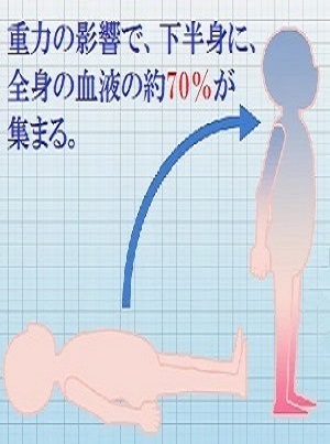 脚・腰の下半身には、重力の影響で、全身の血液量の約70%が集まる為に、下半身に集まった大量の血液を心臓に戻すには、重力に逆らって押し上げる事が必要になります。