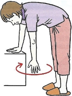 また、背中の肩甲骨周りの筋肉のコワバリをほぐして、血行を改善する為に、『振子体操』や『アイロン体操』などの運動(右図)を行いますが、この運動も、「どのように肩の運動をしたら良いか、分からない」といった事が起きます。