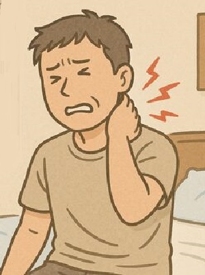 『借金で首が廻らない』と言う言葉があるように、ストレスや不安を感じていると、首の筋肉の中で『胸鎖乳突筋』と呼ばれる太い筋肉が緊張してコワバル性質があるので、首の『胸鎖乳突筋』がコワバッタ状態で寝ていると、首や肩の凝り(寝コリ)が生じたり、“寝違い”を起こしたりするからです。