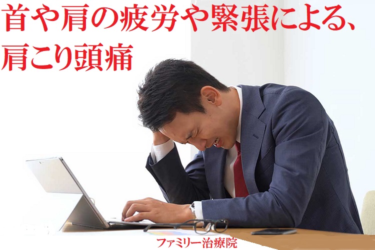 『緊張型頭痛』のは、首や肩の疲労や緊張が強まった事が影響しているので、それに伴って、「肩が重だるい」、「肩の疲労感が辛く感じる」、「肩に突っ張り感と不快感がする」、「首から肩がセメントで固められている感じ」などの“肩こり症状”を伴っています。
