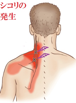 また、首や肩の筋肉のコワバリが慢性化すると、血行悪化が常態化するので、コワバッタ首や肩の筋肉の内部に、筋肉が凝り固まった“シコリ”ができます。